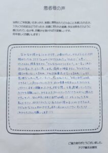 ただ、アクア鍼灸治療院さんで治療を受けるようになり、治療だけでなく、サプリメントの改善点や食事まで様々なことを教えていただき、親身になって相談にも乗ってくれました。
