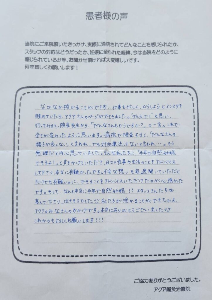 ここまで不妊治療を続ける事が出来、無事に妊娠に至る事が出来たのは、アクア鍼灸治療院に出会えたおかげです!!本当に感謝でしかありません!!