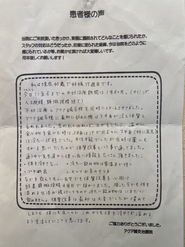 もともと冷え性があり、不妊治療を調べていたら、冷えが悪影響を与えているを知り、アクアのホームページを見ると、実績があり、通える所だったので、プラスアルファのケアとして、アクアに通うことにしました。