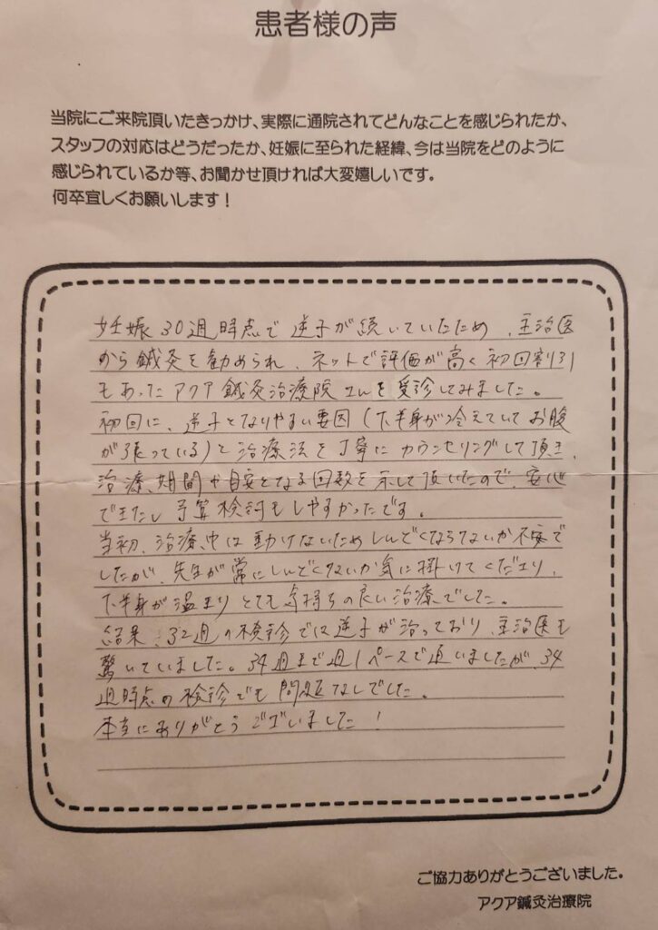 後期に入ってからは逆子がなおらず、そのための治療を積極的に施していただき、31週で無事戻りました。